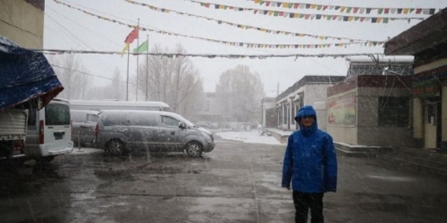 廣西分社援藏記者黃浩銘在海拔4200米左右的定日縣城,五月大雪紛飛。