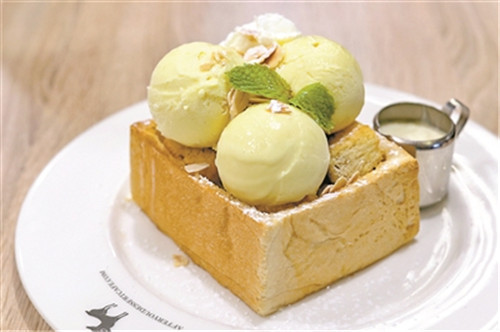 有一家泰國出名的甜品店,專做榴蓮甜品,曼谷有很多分店,里面主要出售榴蓮味道的甜品,包括冰淇淋、冰沙、冰棒等,店內(nèi)的招牌是榴蓮糯米蜜糖吐司,蜜糖吐司上放置著榴蓮味的冰淇淋,熱騰騰的吐司內(nèi)還有泰式糯米,口感特別。