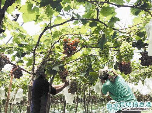 昆明信息港(昆明日報 記者張星宇 實習(xí)記者胡耀元)6月的小江河谷氣溫接近40℃,比溫度更火熱的,是紫牛村紅提種植基地里繁忙的景象。取袋、剪枝、摘果,工人將葡萄裝箱完畢后發(fā)往北京、上海、廣州等城市。這里的葡萄比其他地方提前兩個月上市,市場價格高。去年,1276畝葡萄產(chǎn)量達(dá)3000噸,產(chǎn)值近5000萬元。