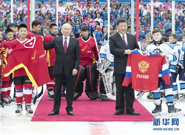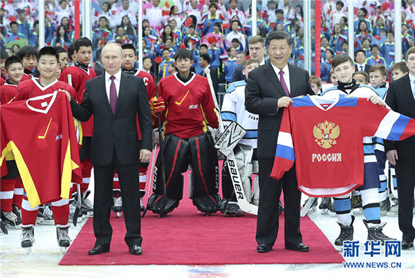 6月8日晚,國(guó)家主席習(xí)近平同俄羅斯總統(tǒng)普京在天津體育館共同觀看中俄青少年冰球友誼賽。兩國(guó)元首同小隊(duì)員們親切交談、合影,并共同為比賽開(kāi)球。新華社記者 龐興雷 攝