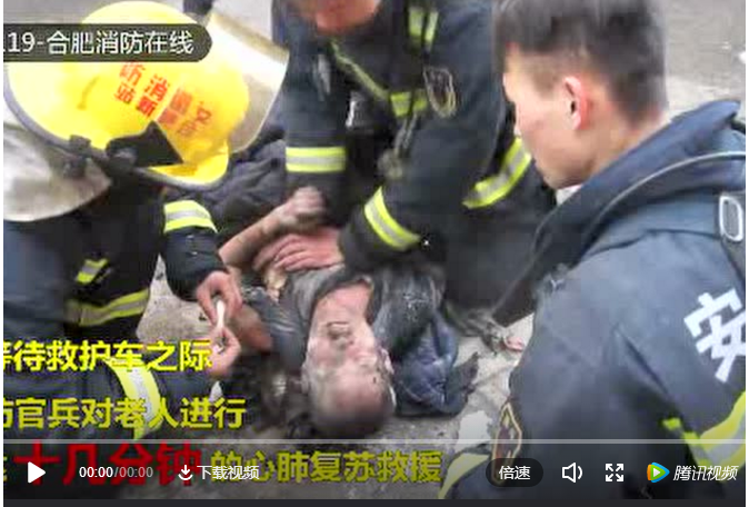 2月1日,安徽合肥市一居民家中發(fā)生火災(zāi),癱瘓多年的老人獨(dú)自在家,接到報(bào)警后,合肥消防支隊(duì)天水中隊(duì)第一時(shí)間趕到現(xiàn)場(chǎng),很快將老人救了出來(lái)。老人被救出時(shí),已沒(méi)有了呼吸,當(dāng)時(shí)120還沒(méi)有趕到。在這緊急時(shí)刻,參與救援的副中隊(duì)長(zhǎng)胡楊想都沒(méi)想,直接跪在了地上,幫老人拿掉假牙,清理嘴里的雜物,做起了心肺復(fù)蘇和人工呼吸。一邊大聲呼喚鼓勵(lì)老人“加油!不要放棄!千萬(wàn)不要放棄!”幾分鐘后,奇跡突然發(fā)生,老人有了知覺(jué)。