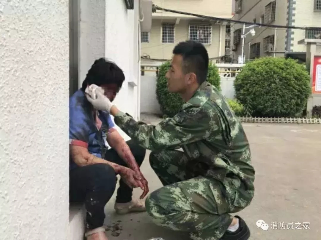 正在午休的消防員聞?dòng)嵖焖仝s到事發(fā)現(xiàn)場(chǎng),找到了全身鮮血淋漓蜷縮在路邊的保潔阿姨,為她擦拭血跡,并及時(shí)送往醫(yī)院。