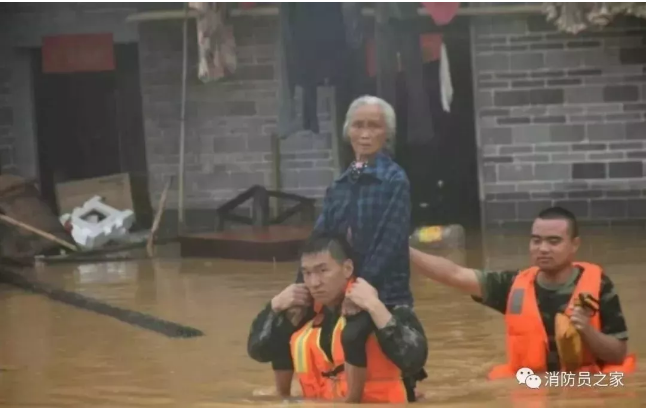 6月8日,受臺(tái)風(fēng)“艾云尼”外圍影響,江西省泰和縣境內(nèi)普降暴雨,造成水位暴漲,這位老人因左腿有疾行動(dòng)不便,沖鋒舟無(wú)法靠近,為了不使她身上被水弄濕,消防戰(zhàn)士讓其騎在肩上,徒步趟過(guò)齊胸深的洪水。