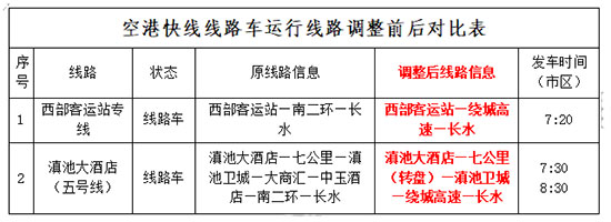 春城晚報(bào)記者從昆明機(jī)場(chǎng)獲悉,因6月22日24:00起,昆明市區(qū)南二環(huán)西段進(jìn)行施工改造,屆時(shí)圍擋施工道路將處于斷交狀態(tài),導(dǎo)致市區(qū)內(nèi)部相關(guān)道路車(chē)流量突增和出現(xiàn)擁堵的情況。在道路改造期間,為確保民航工作人員們能按時(shí)上班,空港快線將于6月23日起對(duì)部分線路車(chē)的發(fā)車(chē)時(shí)間和行駛路線作出如下調(diào)整: