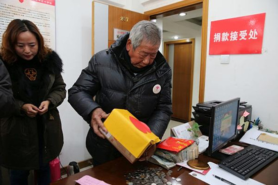 一輛舊自行車(chē)、一張長(zhǎng)條凳、一只竹簍子、一塊磨刀石、一把釣金龜,這便是他的全部“家當(dāng)”。他家境并不富裕,至今還住著三間破瓦房。然而在2008年,當(dāng)汶川發(fā)生地震時(shí),老人拎著一袋子硬幣,來(lái)到南通市紅十字會(huì),嘩一聲將硬幣倒在桌上,請(qǐng)求工作人員清點(diǎn),接受他的捐款。這些硬幣是他3個(gè)多月磨刀掙來(lái)的全部收入1002元,工作人員看著這些凝聚著汗水的硬幣,一再拒絕老人捐款,可是他堅(jiān)持說(shuō):黨號(hào)召我們,一方有難,八方支援,我是黨員,我應(yīng)該這么做。
