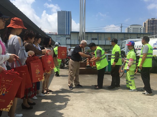 圖為廣西分公司副總經(jīng)理、工會(huì)主席譚目杰向環(huán)衛(wèi)工人分發(fā)慰問品。