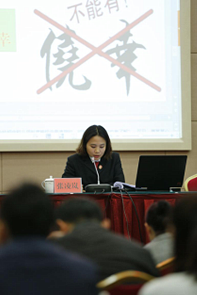 宣講團(tuán)成員結(jié)合一線辦案實務(wù),通過以案說法的形式對貪污受賄、私設(shè)小金庫方面的典型案例進(jìn)行了深刻的剖析。周舒法官以晉寧區(qū)水土保持管理站原副站長范某某因私設(shè)“小金庫”犯濫用職權(quán)罪為例作了題為《切莫輕嘗私設(shè)小金庫的苦果》的宣講。張凌嵐法官以云南煤化集團(tuán)有限公司原副董事長董某某貪污、受賄案為例作了《反腐倡廉 不忘初心》的宣講。錢亞萍同志結(jié)合監(jiān)察體制改革,以市農(nóng)業(yè)局和市殯儀協(xié)會相關(guān)人員違紀(jì)被依法處理為例作了題為《心存敬畏 行有所止》的宣講。