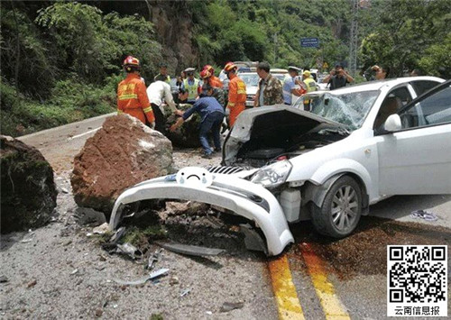 6月26日下午1時許,一輛轎車在行駛至昆祿公路西游洞路段時,路邊的山上突然掉下一塊大石頭,砸中了轎車,車輛受損,1人受傷。接報后,昆明市公安局交警支隊四大隊立即趕赴現場,聯合消防等部門開展救援處置工作。