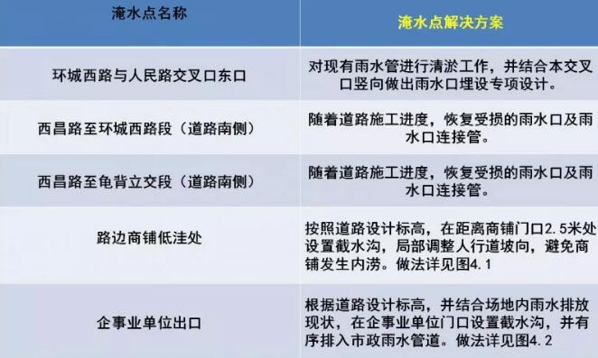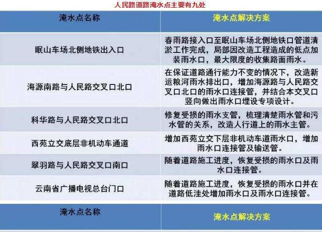 整治眠山車場北側(cè)地鐵出入口、海源南路與人民路交叉口北口、科華路與人民路交叉口北口、西苑立交底層非機動車通道、翠羽路與人民路交叉口南口、云南省廣播電視總臺門口、環(huán)城西路與人民路交叉口東口、西昌路至環(huán)城西路段(道路南側(cè))、西昌路至龜背立交段(道路南側(cè))、路邊商鋪低洼處、企事業(yè)單位出口等淹水點。
