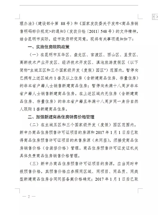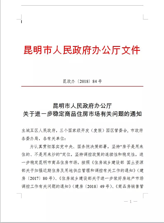 昆明信息港訊 7月1日,昆明市政府辦公廳發(fā)布《昆明市人民政府辦公廳關(guān)于進(jìn)一步穩(wěn)定商品住房市場(chǎng)有關(guān)問(wèn)題的通知》,通知明確:從2018年7月1日起,在昆明市五華區(qū)、盤龍區(qū)、官渡區(qū)、西山區(qū)、呈貢區(qū)高新技術(shù)產(chǎn)業(yè)開發(fā)區(qū)、經(jīng)濟(jì)技術(shù)開發(fā)區(qū)、滇池旅游度假區(qū)范圍內(nèi),暫停向已擁有上述區(qū)域內(nèi)1套及以上住房(含新建商品住房、存量住房的非本省戶籍人士銷售新建商品住房。