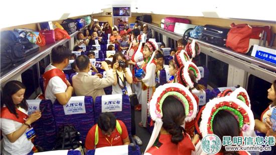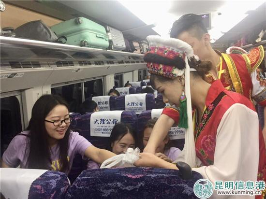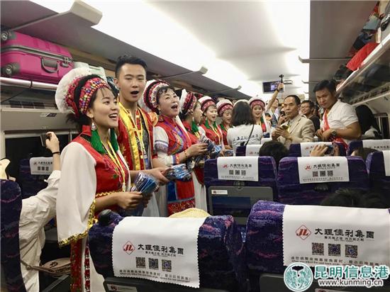 7月1日9時44分,“大理公館號”動車組列車由昆明站始發(fā),途經(jīng)昆明、廣通北、楚雄、祥云、終到大理,歷時約2小時,于12時22分到達(dá)大理站。此次大理佳利集團(tuán)冠名的“大理公館號”列車,從不同角度展示了魅力大理。隨車而行的大理佳利集團(tuán)佳利藝術(shù)團(tuán)金花、阿鵬,用頗具大理白族風(fēng)情的歌舞,近距離地為旅客展示大理民族服飾以及白族這個能歌善舞民族的獨(dú)特魅力,為“大理公館號”上的乘客帶來不一樣的奇妙之旅。