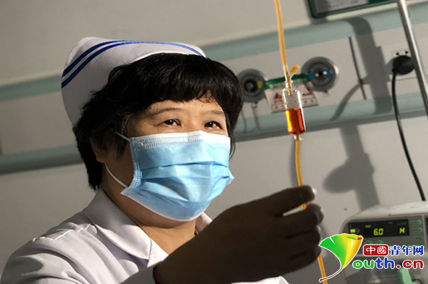 杜麗群在觀察艾滋病患者的點滴情況。廣西南寧市第四人民醫(yī)院供圖