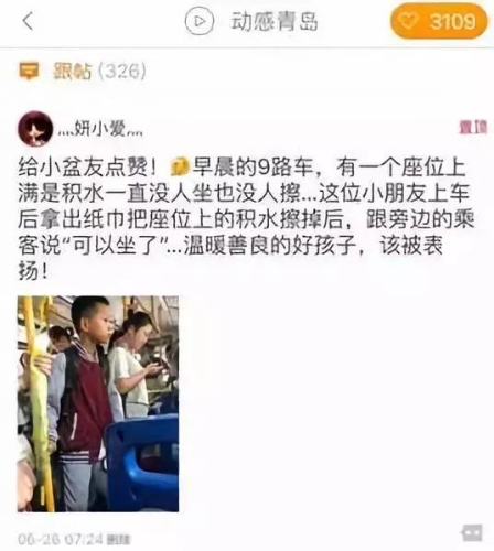6月26日,早高峰擁擠的公交車上,有個座位卻空著。那個座位上有積水,大家都看見了。卻一直沒有人坐,也沒有人擦,直到一個背著書包的小學(xué)生上了車……
