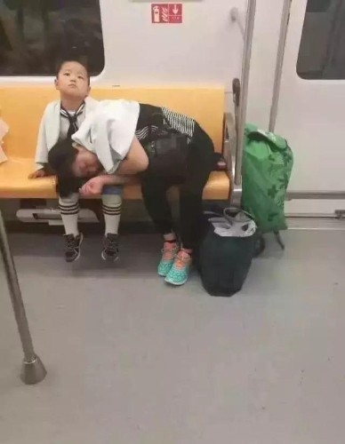 小男孩的媽媽困了,趴在他的腿上,小男孩不時拍拍媽媽,怕坐過站,每到一站時就告訴媽媽到哪站了。小時候媽媽保護我們,長大后要保護好媽媽,你一定是上帝派來保護媽媽的小天使。