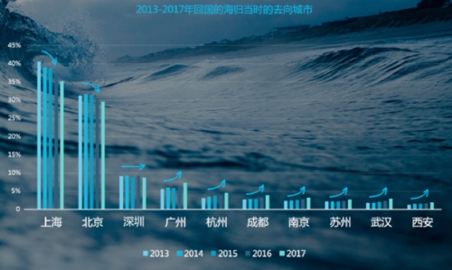 與此同時(shí),“新一線城市”對(duì)海外人才的吸引力也呈現(xiàn)上升趨勢(shì)。報(bào)告顯示,盡管近年來(lái)海歸回國(guó)后選擇的主要城市排名沒(méi)有變化,但北京和上海所占百分比明顯下降,而以杭州和成都為代表的“新一線城市”的吸引力逐年上升。