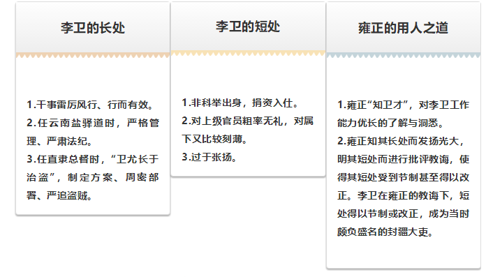 然而,李衛(wèi)并非完人,他也有自己的弱點和缺失。他對上級官員粗率無禮,對屬下又比較刻薄。雍正知其長處而發(fā)揚光大,明其短處而進行批評教誨,使得其短處受到節(jié)制甚至得以改正。雍正“察衛(wèi)尚氣,屢教誡之”。當(dāng)雍正得知李衛(wèi)在云南做官,李衛(wèi)令人制作“欽用”牌子掛在儀仗隊中示眾,過于張揚,雍正對其進行教誨:“爾其謹慎,毋忽!”“汝宜勤修涵養(yǎng),勉為全人,方不負知遇?!崩钚l(wèi)在雍正的教誨下,短處得以節(jié)制或改正,成為當(dāng)時頗負盛名的封疆大吏。