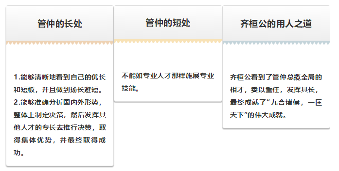 管仲的短板在于不能如專業(yè)人才那樣施展專業(yè)技能,于是他向齊桓公推薦了五個人:“對各種朝班禮儀,我不如隰朋熟悉,請他來做大行吧;開荒種地,充分發(fā)揮地利,我不如寧戚在行,請讓他來做司田吧;戰(zhàn)場之上,能讓兵車不亂,士兵不跑,讓三軍將士視死如歸,我不如王子城父,請任命他為大司馬吧;判案公正,不濫殺無辜,不冤枉好人,我不如賓胥無,請讓他來做大理吧;敢于直諫,不畏權(quán)貴,不怕殺頭,我不如東郭牙,請他來做大諫吧。”這種客觀分析建立在管仲對五子專職才華在自己之上的判斷上,他們正好可以補己之短。管仲的長處在于能夠準確分析國內(nèi)外形勢,整體上制定決策,然后發(fā)揮其他人才的專長去推行決策,取得集體優(yōu)勢,并最終取得成功。