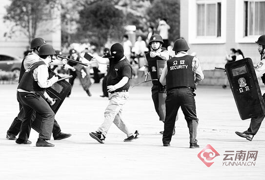 上述險情,只是由云南財經(jīng)大學、昆明市公安局五華分局攜手云南眾安保安服務有限公司舉行的一場模擬暴恐分子沖擊校園的演習。
