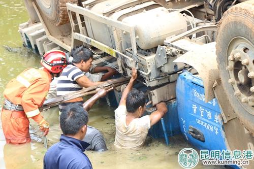 10時(shí)54分,救援官兵到達(dá)現(xiàn)場,經(jīng)了解得知,一輛載滿泥土的貨車因駕駛員操作不當(dāng)側(cè)翻至路邊的魚塘內(nèi)。貨車側(cè)翻的危急關(guān)頭,駕駛員準(zhǔn)備跳車自救,不料其右手臂被卡在貨箱與車體之間無法動(dòng)彈。周邊群眾立即撥打120求救,醫(yī)護(hù)人員到場后無法將其手臂移出,便決定求助消防官兵。