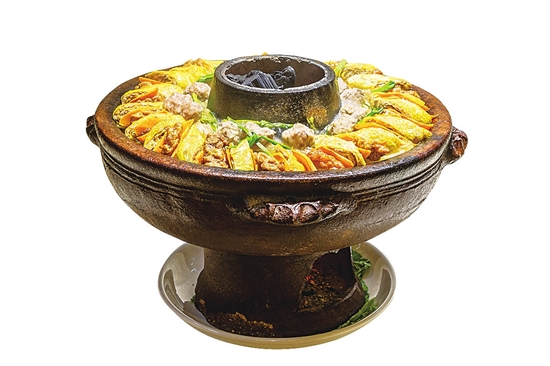 大團(tuán)圓也叫鍋子菜,因為過年過節(jié)家家都會準(zhǔn)備一鍋,全家圍坐一桌,一起享用而得名。用土鍋子烹制是大團(tuán)圓美味的原因。用雞和鮮排骨熬成骨湯,底菜豐富——青菜為主配以芋頭、山藥、白蘿卜、胡蘿卜、油炸臭豆腐、黃筍、黃條、酥肉、泡皮等十幾種原料制作而成。因為鍋子是陶土制成,能夠吸收鍋中原料的香味,且保持原汁原味。