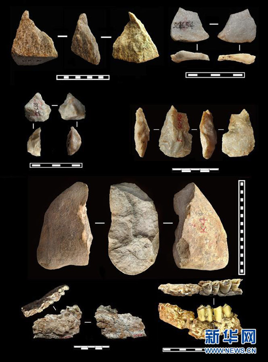 出土于上陳舊石器遺址的距今約212萬年的部分舊石器和動物化石(資料照片)。新華社發(fā)