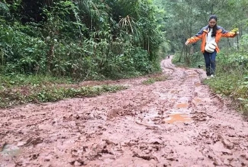 天空下著雨,山路泥濘難行