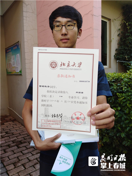 “收到北京大學(xué)錄取通知書有種特別的感覺,這意味著我的高中生活已畫上圓滿的句號,即將開啟美好的大學(xué)生活?!?月16日上午10點50分左右,曾昭牧吾在接過云南郵政EMS投遞員送達的北京大學(xué)高考錄取通知書時高興地說。曾昭牧吾告訴記者,他畢業(yè)于云南師范大學(xué)附中,今年高考總分683分(文科),位次是云南全省第16名。當(dāng)談到成績時,曾昭牧吾透露,他月考時成績也考砸過,這次考出理想的成績,除平時好好學(xué)習(xí)外,最關(guān)鍵的是要調(diào)整好心態(tài),現(xiàn)在拿到通知書,他想去旅游一趟。