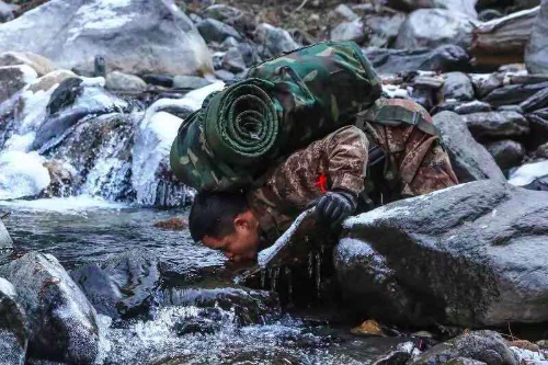 2018年1月10日,西藏一條邊防線上,一名巡邏戰(zhàn)士俯下身來喝冰水。