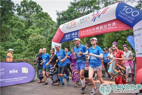 在渾汗如雨的熱帶雨林中奔跑,金飛豹一行跑的異常艱難。坡路的起伏、潮濕悶熱的空氣讓今天的賽事增添不少艱辛。13時(shí)許,在西雙版納熱帶雨林國(guó)家公園孔雀山莊,金飛豹沖過終點(diǎn)。等候在終點(diǎn)的傣族小伙、姑娘們?yōu)榻袢盏膭P旋者敲鑼打鼓,歡慶“秘境百馬”第六十一站順利結(jié)束。