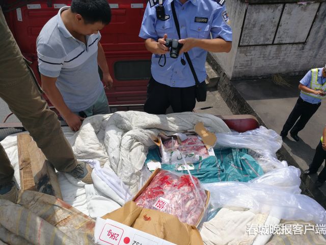 撕開外包裝后,滿滿一車類似冰凍肉的鮮紅色塊狀物映入眼簾,在事實面前,駕駛員才承認他所運輸?shù)氖且徽嚨谋鶅雠H狻?/p>