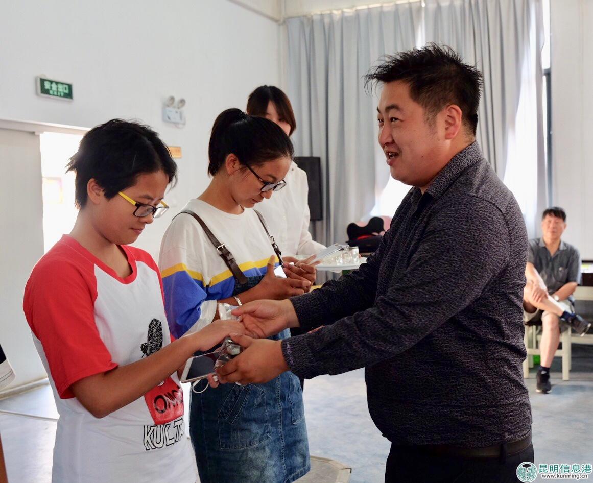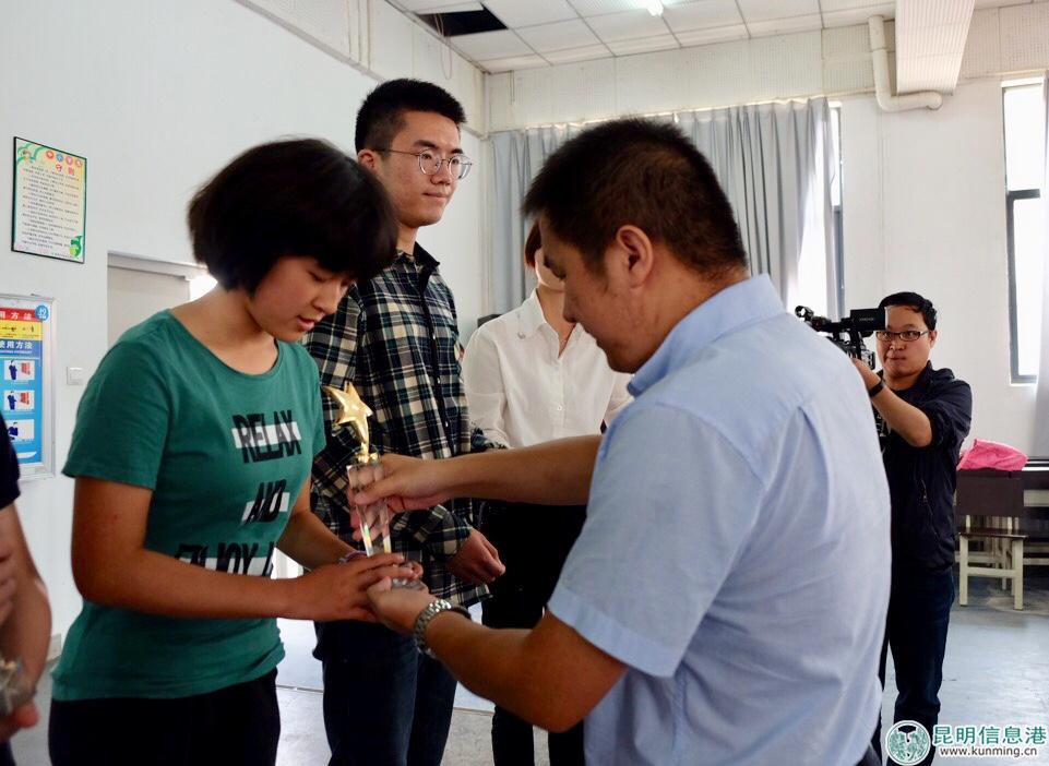 共青團(tuán)昆明市委學(xué)校部部長李京臻為獲獎?wù)哳C獎。記者張薇/攝