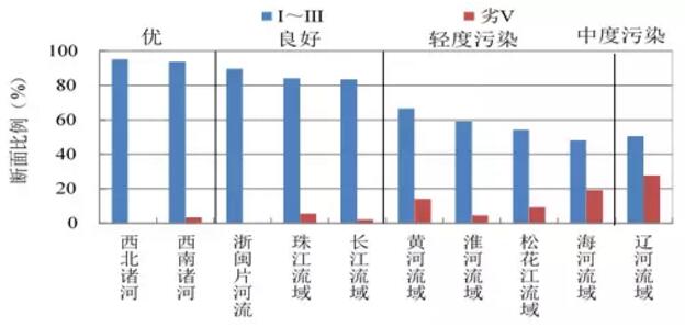 十大流域中,西北諸河和西南諸河水質(zhì)為優(yōu),浙閩片河流、珠江和長(zhǎng)江流域水質(zhì)良好,黃河、淮河、海河和松花江流域?yàn)檩p度污染,遼河流域?yàn)橹卸任廴尽?/p>