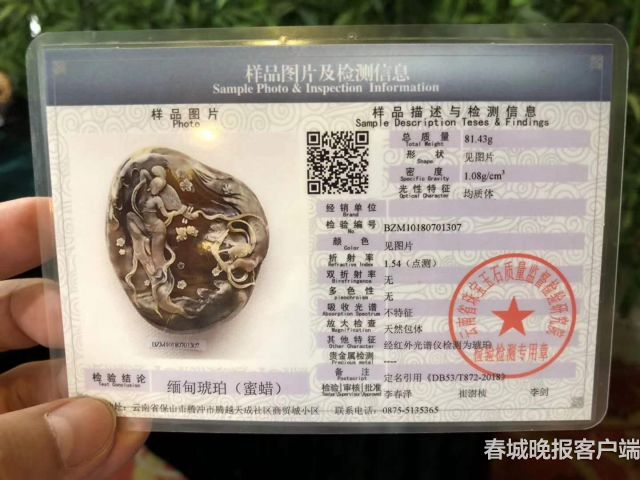 當(dāng)天的發(fā)布會(huì)上,來(lái)自騰沖當(dāng)?shù)氐氖詹貝?ài)好者楊先生的緬甸琥珀收藏品《飛天》,成為《緬甸琥珀》地方標(biāo)準(zhǔn)發(fā)布實(shí)施后的第一個(gè)幸運(yùn)兒,云南省珠寶玉石質(zhì)量監(jiān)督檢驗(yàn)研究院院長(zhǎng)吳云海向楊先生頒發(fā)了第一張《緬甸琥珀》鑒定證書(shū)。