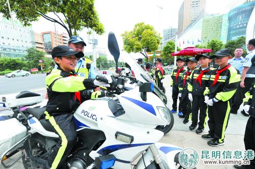 昆明信息港訊(昆明日報 記者劉凱達(dá) 陳雯)騎著警用巡邏摩托車穿梭在大街小巷,一身螢綠條紋相間的身影出現(xiàn)在交通事故現(xiàn)場,果斷、快速處理問題,春城騎警已然成為昆明最炫酷的風(fēng)景線,同時也成為很多小朋友的夢想職業(yè)。在滇池國家旅游度假區(qū)第二小學(xué),一群小朋友就組成了春城“小騎警”,圓了自己的夢想。