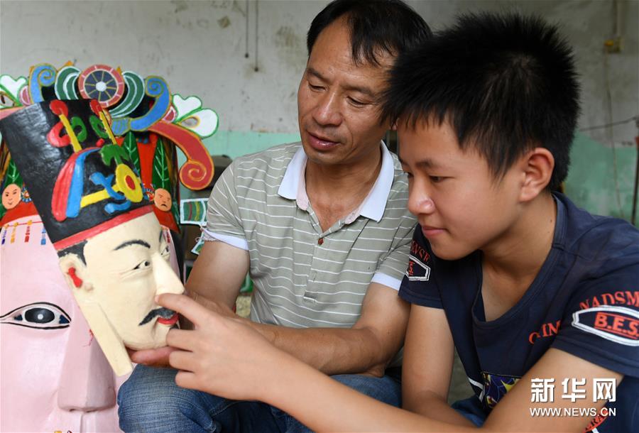 方文展在給兒子方庭源(右)講述毛南族儺面的雕刻技巧