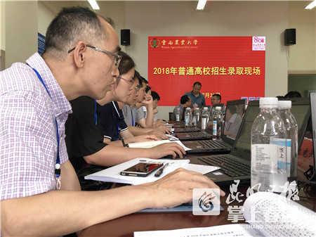 在云南農(nóng)業(yè)大學(xué)普通高校招生錄取工作現(xiàn)場(chǎng),18個(gè)學(xué)院的相關(guān)負(fù)責(zé)人坐在電腦前,秉承著信息公開(kāi)、透明的原則,正在進(jìn)行閱檔,他們按照分?jǐn)?shù)高低、志愿填報(bào)情況、體檢是否合格等相關(guān)標(biāo)準(zhǔn),逐一瀏覽提檔考生信息?!拔覄偛趴吹阶约旱拿掷?!”今年報(bào)考了云南農(nóng)業(yè)大學(xué)茶學(xué)專(zhuān)業(yè)的牛淼同學(xué)興奮地說(shuō)道,她表示,自己是文科生,今年考了569分,“我自己對(duì)茶葉很感興趣,家里人也很支持我,所以我就沒(méi)打算接受調(diào)劑?!迸m岛湍赣H在學(xué)校的安排下,參觀了校園,還直擊招生錄取工作全過(guò)程。“學(xué)校老師一一為我們解答問(wèn)題,還為我們講解學(xué)校的歷史、院系、專(zhuān)業(yè)、管理等相關(guān)內(nèi)容,他們也告知孩子,文科生學(xué)習(xí)茶學(xué)的難度主要在化學(xué),聽(tīng)了老師們的介紹,我更放心了。”牛淼母親丁女士說(shuō)。