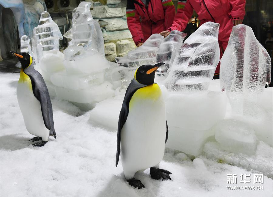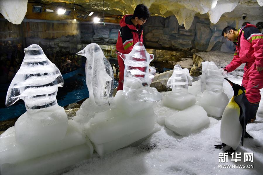 工作人員在青島海昌極地海洋公園企鵝館內(nèi)維護冰雕