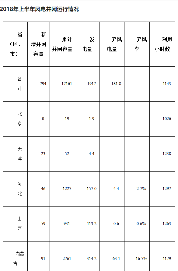 據(jù)國(guó)家能源局網(wǎng)站消息,2018年1-6月,全國(guó)新增風(fēng)電并網(wǎng)容量794萬(wàn)千瓦,到6月底累計(jì)風(fēng)電并網(wǎng)容量達(dá)到1.716億千瓦;1-6月,全國(guó)風(fēng)電發(fā)電量1917億千瓦時(shí),同比增長(zhǎng)28.7%;平均利用小時(shí)數(shù)1143小時(shí),同比增加159小時(shí);1-6月,全國(guó)棄風(fēng)電量182億千瓦時(shí),同比減少53億千瓦時(shí)。
