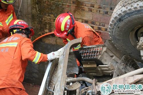 昆明信息港訊 記者勞學麗 通訊員楊義德 7月31日16時15分,文山州麻栗坡消防大隊指揮中心接到報警稱,麻栗坡縣盤龍小學公路旁一輛水泥罐車發(fā)生側翻,一名駕駛員被困車內,請消防大隊前往救援。