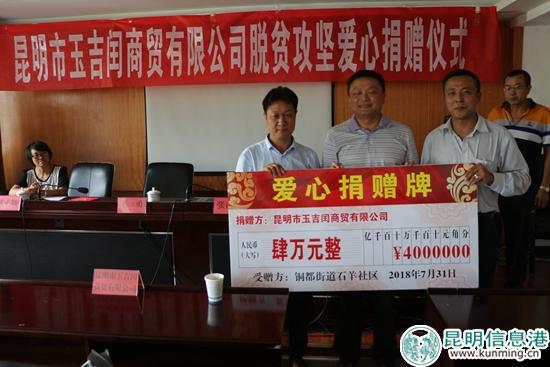 昆明信息港訊 通訊員 吳曉麗 王長(zhǎng)紅 在東川全區(qū)上下深入推進(jìn)脫貧攻堅(jiān)的關(guān)鍵時(shí)刻,昆明市玉吉閏商貿(mào)有限公司于7月31日,為銅都街道辦賴石窩村捐款6萬(wàn)元,為石羊社區(qū)捐款4萬(wàn)元,用于兩村脫貧攻堅(jiān)工作。