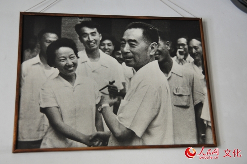 原以為老人定會(huì)提及那個(gè)家喻戶曉的經(jīng)典形象“江姐”,沒想到,于藍(lán)老師脫口而出的卻是——“周蓮”??吹轿覀冇行┎唤?她回頭指了指身后掛著的那張黑白老照片——照片中的周總理正當(dāng)著眾人的面,高興地握著于藍(lán)的手說著什么,于藍(lán)頷首微笑,認(rèn)真傾聽。