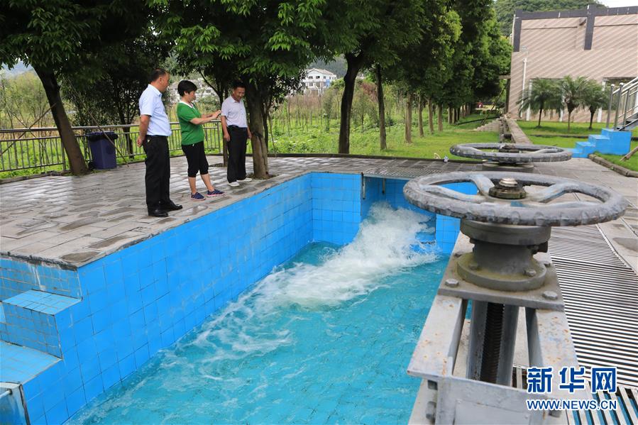 2018年7月15日,貴州興義市桔山河市級河長葛佳華(中)、鎮(zhèn)級河長陳再云(左)和村級河長陳明君在桔山污水處理廠的出水口進行巡查。新華社記者 歐東衢 攝