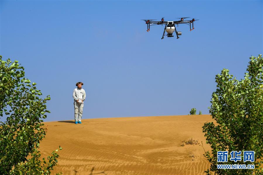 在內(nèi)蒙古鄂爾多斯市杭錦旗的庫布其沙漠中,技術(shù)人員操控?zé)o人機飛播造林(7月11日攝)。新華社記者 彭源 攝