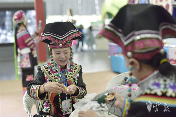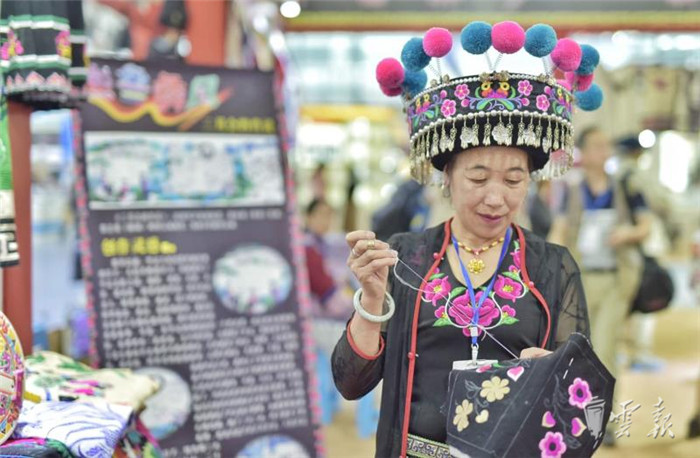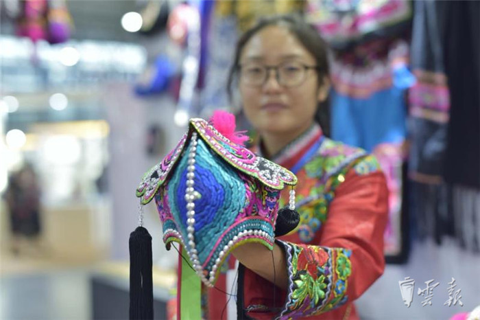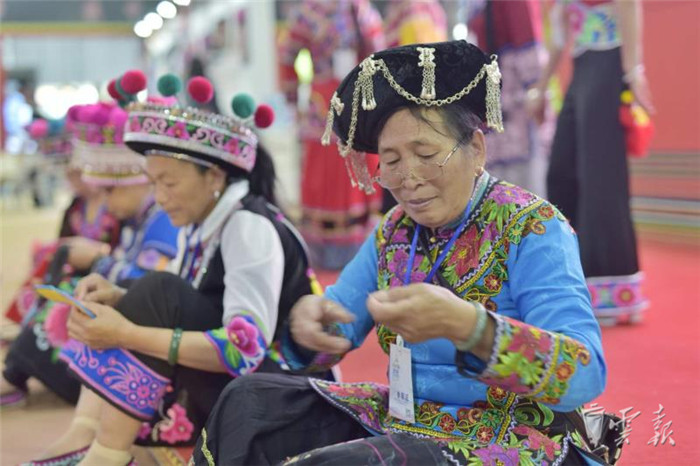 在文博會(huì)五號(hào)(州市)館內(nèi),楚雄州展區(qū)打彝繡品牌,來自武定、元謀、永仁、牟定、南華等縣市的18家刺繡企業(yè)的40位繡娘同場展示刺繡技藝,現(xiàn)場五彩繽紛,大有可觀?!霸谖涠ㄒ妥宕逭?刺繡是女孩必備的一項(xiàng)技能,適齡出嫁時(shí)更要為自己繡制嫁妝?!眮碜晕涠ㄒ痛宓?9歲姑娘伍香蔓從6歲開始學(xué)習(xí)刺繡,如今已經(jīng)熟練掌握刺繡的針法。她介紹,武定彝族刺繡精巧雅致,細(xì)節(jié)之處也能看到土司文化的精髓。在傳統(tǒng)民族服裝中,女孩的頭飾尤其引人注目,形如公雞雞冠,因此有公雞帽之稱,“公雞帽是彝族女孩出嫁必備品,必須由母親或者外婆親自繡制。在武定彝族女孩的心目中,一頂帶著心意的公雞帽就是家人對(duì)自己未來婚姻生活的美好祝愿?!?/p>