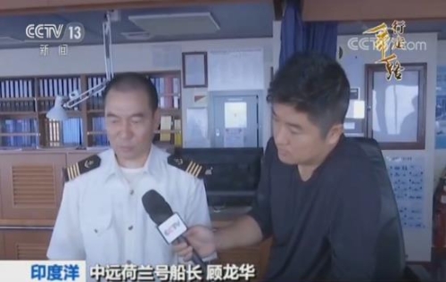 記者:“這里是裝載著超過11000多個(gè)集裝箱,正沿著海上絲綢之路歐洲線一路向西航行的中遠(yuǎn)荷蘭號(hào)集裝箱貨輪。從上個(gè)月的28日上海出發(fā)以來(lái),現(xiàn)在,我們已經(jīng)行駛到了到了印度洋的海面上。在這十多天的航行中,給我印象最深的就是即便是像現(xiàn)在已經(jīng)行駛在大洋之中航行,我們的荷蘭號(hào)也并不孤獨(dú)。大家看我們身后,一艘和荷蘭號(hào)幾乎同等規(guī)模,甚至是比我們還要大一些的集裝箱貨輪,也在這條絲路航線和我們并行航行著。 ”