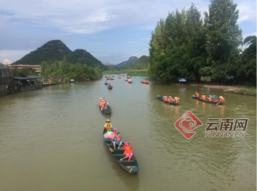 越來越多的游客在普者黑濕地公園水道乘船玩耍