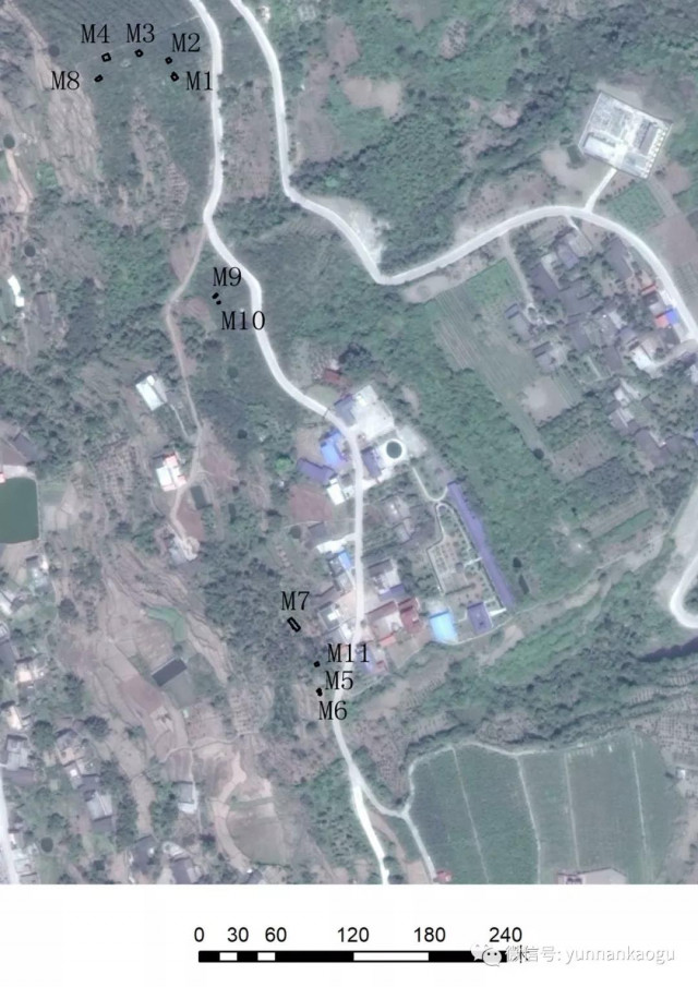 南岸墓地位于昭通市綏江縣南岸鎮(zhèn)南岸村真武山上,東臨金沙江右岸僅百余米,東南距綏江縣城16公里。墓葬零散分布在東西長500米、寬約150米的緩坡地帶,現(xiàn)存地表可辨認墓葬數(shù)十座。為配合擬建的昭樂高速(串絲至新市段)珍珠壩大橋建設(shè),2018年4月至5月,云南省文物考古研究所聯(lián)合昭通市文物管理所、綏江縣文物管理所對施工影響區(qū)域的墓葬進行搶救性發(fā)掘,發(fā)掘面積1000平方米,清理墓葬11座。