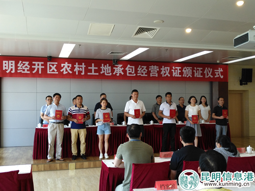昆明信息港訊 通訊員蘇毅 8月14日,昆明經(jīng)開區(qū)舉行了農(nóng)村土地承包經(jīng)營權(quán)證頒證儀式,區(qū)黨工委副書記王富昌、城鄉(xiāng)發(fā)展部副部長陳衛(wèi)政、農(nóng)業(yè)局局長張冰清、區(qū)土地確權(quán)領(lǐng)導(dǎo)小組各成員單位分管領(lǐng)導(dǎo)、社區(qū)居民代表參加了儀式,會(huì)議邀請了昆明市農(nóng)業(yè)局副局長楊朝云,官渡區(qū)、呈貢區(qū)農(nóng)林局領(lǐng)導(dǎo)到會(huì)指導(dǎo)。