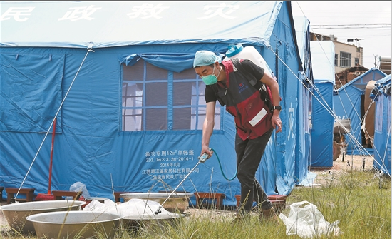 在地震災(zāi)區(qū),不時(shí)看到一群頭戴藍(lán)色帽子,身穿白大褂或紅黑相間馬甲的疾控衛(wèi)生防疫工作人員,肩上背著醫(yī)用噴霧器,不斷穿梭于各村組、社區(qū)和受災(zāi)群眾安置點(diǎn)。