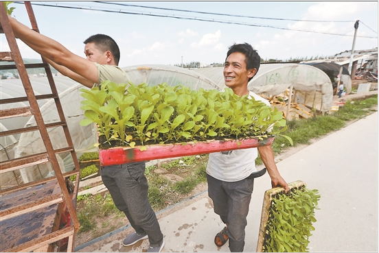 四街鎮(zhèn)者灣村蔬菜育苗戶正在為客戶發(fā)送訂購的菜苗。 本報記者 楊崢 攝